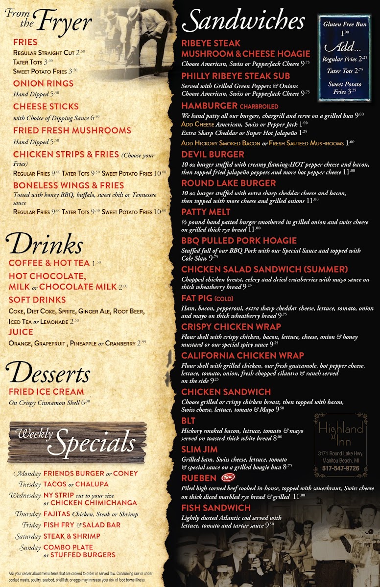 Introducing the menu at Highland Inn promises a delightful culinary journey in the heart of Manitou Beach, MI. Known for its dedication to quality and flavor, Highland Inn offers a tantalizing array of sandwiches, including the Ribeye Steak Mushroom & Cheese Hoagie and Devil Burger. The Philly Ribeye Steak Sub is particularly popular among patrons craving robust flavors.